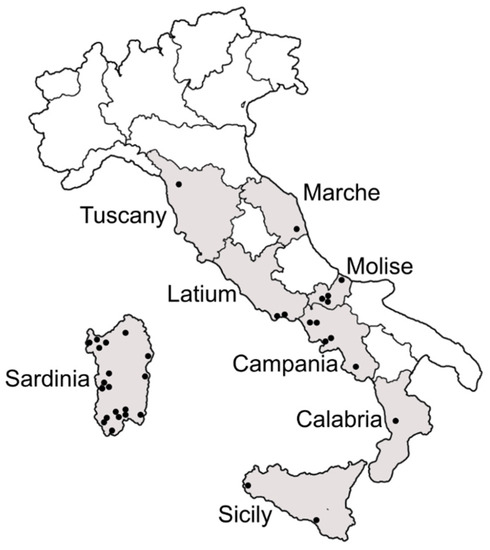 Map of Italy showing the regions and the localities (black dots) inspected for the presence of Bemisia tabaci.