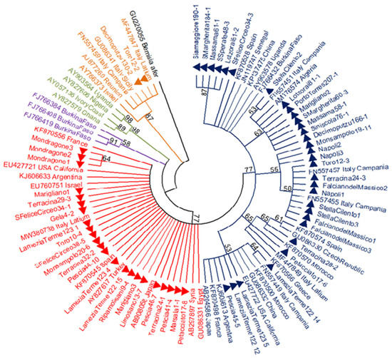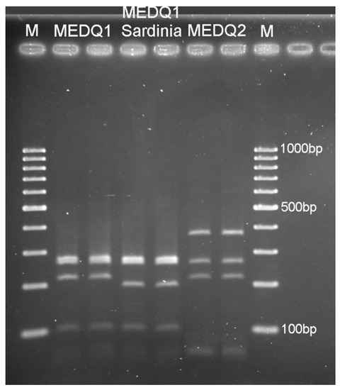 The MEDQ1 sequences showed higher levels of genetic variability and were distributed into different clusters (Figure 2). The cluster supported by the highest bootstrap value (87%) was composed of five samples from Sardinia only: two samples collected in south (Santa Margherita 184-1, accession number MW604184; San Sperate 48-3, MW604186), two in central-west (Siamaggiore 190-1, MW604183; Massama 61-1, MW604185) and one in central-east (Lotzorai 81-2, MW604182) Sardinia. These COI sequences were also characterised by one more ApoI cutting site at position 672 bp and had a PCR-RFLP pattern that is slightly different from the other known MEDQ1 haplotypes (Figure 3).