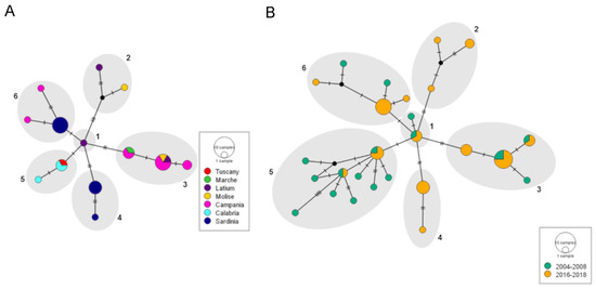 Median Joining haplotype networks showing (A) the geographic relationship among thirteen MEDQ1 haplotypes of Bemisia tabaci collected in Italy between 2017 and 2018; (B) the temporal relationship among the MEDQ1 haplotypes of B. tabaci at two collection periods, 2004–2008 and 2016–2018. The main haplotype groups (1–6) are hand-drawn to assist in visualisation.