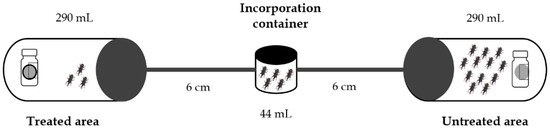 The repellent action was measured using an olfactometer with static air, consisting of two 290 mL bottles connected by a tube (l = 6 cm, d = 0.7 cm), with a container (44 mL) located in the central part of the duct (Figure 1). In one of the bottles corresponding to the treatment, a 1.5 mL vial was placed that had a 2 cm diameter Whatman® No. 1 paper disc impregned with different volumes of EO, corresponding to concentrations between 6.2–22.7 μL/L of air. In the other bottle was placed a 1.5 mL vial with paper without EO, and this acted as a control. Adult S. zeamais insects (20 per assembly) were incorporated through the central container of the connecting tube. The test was executed in darkness, and the olfactometer was rotated in order to make sure that the behavior of the insects only depended on the repellent action. The activity reading was done at 2, 6, and 24 h after the application, and the number of insects present in both containers (treated and untreated) were recorded. All treatments were performed in triplicate [26]. The repellency percentage (RP) was calculated as