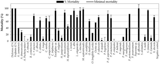 Screening of insecticidal activity for 45 EOs, evaluated at a concentration of 500 µL/L air, against S. zeamais.