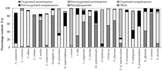 The GC–MS analysis with orthogonal polarity columns of the 24 EOs allowed the identification of 166 compounds, corresponding to 83–99% of the total composition. In Figure 3, percentage contents of the main chemical classes of the essential oil components are reported. In Table S2, the compounds are presented according to the elution order obtained with the DB-5MS column; the retention index for both columns (DB-5MS and HP-INNOWax), the refractive index, and the density for each of the EOs are also reported.