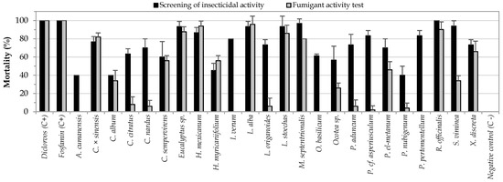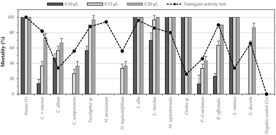 The results of the contact and fumigant toxicities of the 14 EOs that presented mortality rates greater than 25% in the fumigant test are illustrated in Figure 6. It was observed that 13 EOs exhibited fumigant and contact activities, while H. mexicanum EO was the only one that did not cause contact mortality. The EOs from C. × sinensis, C. sempervirens and H. myricariifolium, although they were toxic by contact in all the quantities evaluated, caused higher mortalities when they were evaluated as fumigants at a concentration of 500 µL/L of air. In contrast, the oils from S. viminea, M. septentrionalis, Ocotea sp., and C. album, although they exhibit fumigant activity at the concentrations evaluated, caused higher mortality rates when the oils were applied directly to the insect at all the quantities tested.