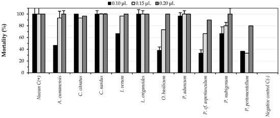 The fumigant test carried out against S. zeamais suggested that 10 of the 24 EOs could present, mainly, a contact effect because their lethal effects in the fumigant assays were less than 10%. The results of these oils in the topical contact toxicity test are illustrated in Figure 5; here, it can be seen that these 10 EOs caused mortality in ranges from 30 to 100%, confirming the observed behavior in the fumigant tests. Similarly, it was found that the oils of P. aduncum, L. origanoides, C. nardus and C. citratus were the most active by contact, causing mortality greater than 90% in the three quantities evaluated. For the remaining six EOs, it was shown that the percentage of mortality increased proportionally with the amount of oil applied.