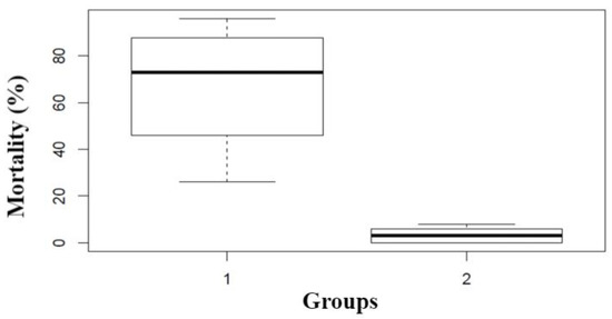 To verify the section of the final sample, a Box-Plot diagram was constructed (Figure 7), in which the %mortality caused in the fumigant method is represented for the EOs that make up group I (selected EOs) and the group II (EOs discarded), observing marked differences between the two groups. In group I it is observed that approximately 25% of the EAs that comprise it can cause mortalities greater than 40% with a concentration of 500 µL/L air, and that approximately 50% of the EAs can cause mortalities greater than 70% at the same concentration. On the contrary, in group II it is found that the oils of this group cause mortalities of less than 10%.