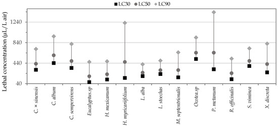 Scatter plot of the different lethal concentrations of fumigant toxicity for the 14 active EOs.