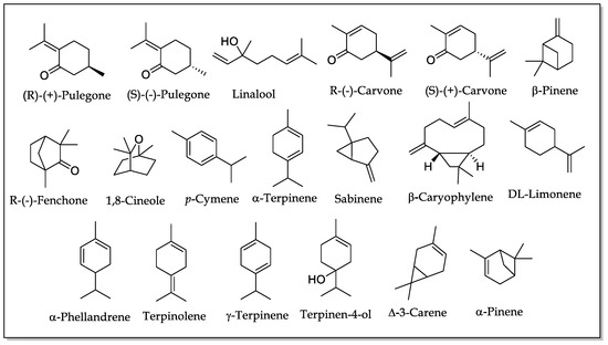 - Dambolena, J.S.; Zunino, M.P.; Herrera, J.M.; Pizzolitto, R.P.; Areco, V.A.; Zygadlo, J.A. Terpenes: Natural products for controlling insects of importance to human health—A structure-activity relationship study. Psyche 2016, 2016, 1–17. [Google Scholar] [CrossRef]