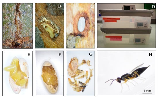 Laboratory rearing of the parasitoid A. fukutai: (A) T-shaped oviposition scar of A. chinensis in a Salix log containing an egg which was exposed to the parasitoid for parasitization, (B) an unparasitized egg (hatched with sawdust from larval feeding), (C) a parasitized egg (swollen) containing mature parasitoid larvae, (D) excised parasitized eggs placed in 24-well cell culture plates inside a humidity box, (E) heathy parasitoid larvae, (F) dead parasitoid larvae after diapause, (G) dead parasitoid pupae and unemerged adults after diapause, and (H) an emerged adult female parasitoid.