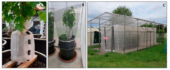 Exposure of A. fukutai adults to A. chinensis eggs on potted maple trees and rearing of the parasitoid under semi-natural conditions: (A) A. chinensis egg-infested tree exposed to parasitoid oviposition inside a sleeve cage, (B) potted tree with a hardware mesh cage to prevent the escape of adult A. chinensis, and (C) field test tent made of fine mesh in the certified outdoor quarantine enclosure at EBCL, protected by a plastic roof and metal fence.