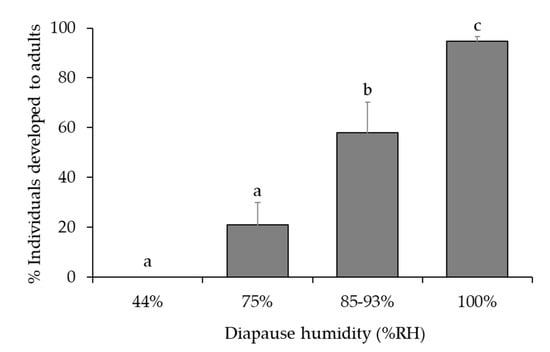 Effect of humidity conditions (see Table 1) on diapause survival of A. fukutai after being held at 15 °C and 12L:12D for one month and subsequently at 11 °C and 10L:14D for 6 months within parasitized A. chinensis eggs. Bars are mean + SE and different letters above the standard error bars indicate significant differences (Tukey’s HSD, p < 0.05).