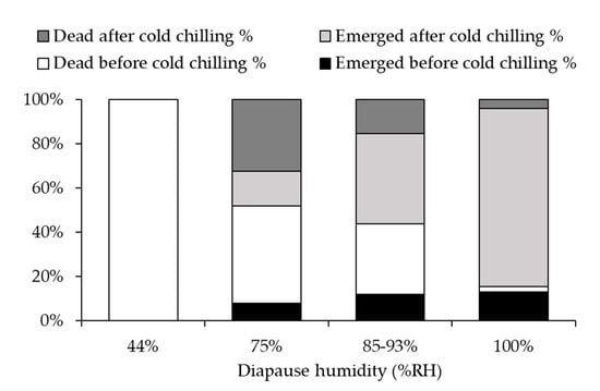 Survival and emergence of A. fukutai larvae pre- and post-cold chilling at different humidity conditions (see Table 1). Values are the percentage of emerged and dead individuals within the parasitized A. chinensis eggs.