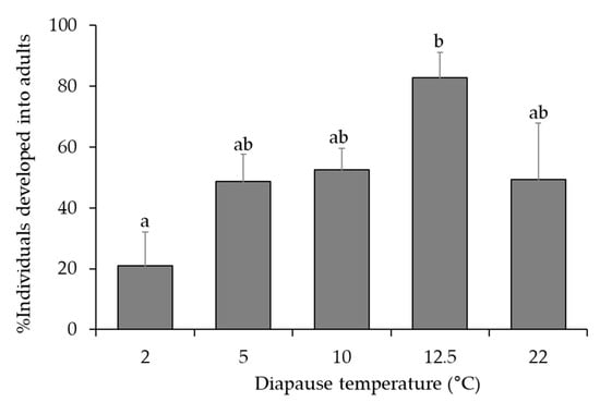 Effect of temperature regimes (see Table 1) on diapause survival of A. fukutai after being held for cold chilling in the dark and at 100% RH for 6–7 months or at normal rearing conditions continually (22 °C, 100% RH and 14L:10D). Bars are mean + SE and different letters above the standard error bars indicate significant differences (Tukey’s HSD, p < 0.05).