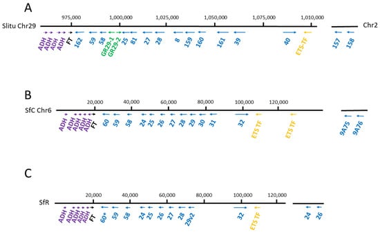 CYP9A cluster in the genome of S. litura (A), S. frugiperda corn strain (B) and S. frugiperda rice strain (C). Numbers in blue correspond to CYP9A genes. Arrows correspond to gene orientation, ADH: alcohol dehydrogenase, FT: fucosyl transferase, EST TF: E26 transformation specific transcription factor, * pseudogene.