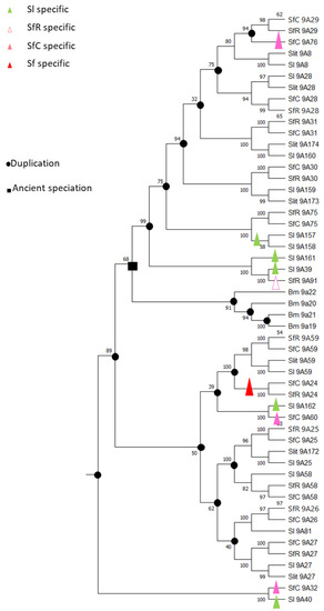 CYP9A subtree: ML phylogeny with bootstrap value. SfC: S. frugiperda corn strain, SfR: S. frugiperda rice strain, Sl: S. litura, Slit: S. littoralis, Bm: B. mori. Slit9A58, Slit9A81, and Slit9A40-like are missing from the tree. Black square: ancient speciation representing B. mori split from Spodoptera species. Black dot: duplication events.