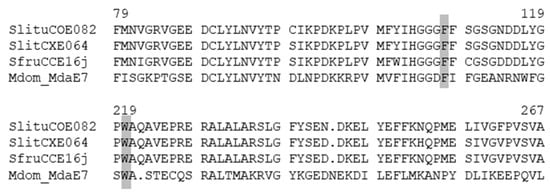 Alignment of two 50 amino acid sequence portions of SlituCOE082, SlitCXE64, SfruCCE16j and MdaE7 from Musca domestica (Rutgers diazinon-R resistant strain). The putative mutation positions G151D and W271L are shaded in grey. According to [67], the amino acid corresponding to G137D and W251L were G107 and W219 in S. litura sequence; for S. litura carboxyl/cholinesterase (CCE), the mutation tested in vitro was G151D. Genbank accession number, S. frugiperda (XP_035450257.1), S. litura (XP_022828113.1), M. domestica (AAD29685.1).