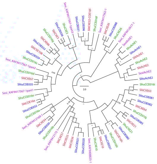 Insect CCEs fall into three main functional groups, representing dietary/detoxification, hormone/semiochemical processing, and neuro/developmental functions [50]. A comprehensive phylogenetic analysis of CCE sequences isolated from H. armigera, H. zea, B. mori and Manduca sexta genomes has recently refined the CCE nomenclature in Lepidoptera [51]. The neuro/developmental class comprises seven clades (027 to 033) with generally catalytically incompetent proteins, excepted for AChEs (clade 027). The hormone/semiochemical processing class (clades 020 to 026) includes among others, juvenile hormone esterases, several pheromone-processing esterases, but also some CCEs (clade 026) previously associated with organophosphate (OP) resistance in Hemiptera (namely E4, FE4, [10]). Finally, the dietary/detoxification group (clades 001 to 019 and 034) is the most diversified: some enzymes have been implicated in semiochemical processing but most of them have been associated with dietary and detoxification functions, including insecticide resistance for some dipteran and hymenopteran CCEs (the α-esterases, reviewed in [47]). CCEs from this third group are the most abundant in Lepidoptera and in particular the three most numerous clades (001, 006 and 016) with species-specific radiations. Many clades in this third group are also Lepidoptera specific [51]. The total number of CCE genes identified so far in S. litura and S. frugiperda genomes were 110 and 96, respectively [1,28]. For S. exigua, we were able to retrieve 73 sequences from public database (GenBank:GCA 011316535.1). For S. littoralis, we have previously identified 30 CCE transcripts expressed in antennae [52,53,54]. This repertoire was supplemented with 26 new sequences by Walker et al., (2019) [55]. Searching in our RNAseq databases allowed us to identify an additional 19 CCE transcripts (Table S1), leading to a total of 65 SlitCCE sequences, which is likely underestimated compared to its sister species S. litura.