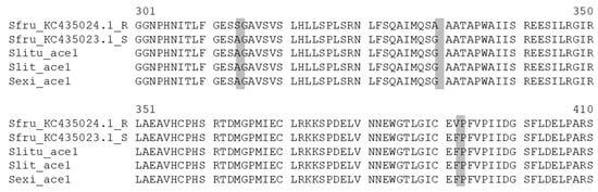Alignment of a 120 amino acid sequence portion of AChE1 S. frugiperda susceptible (Genbank accession number KC435023.1) and resistant strain (KC435024.1) with orthologous sequences from S. litura (XP_022819835.1 = SlituCOE002), S. littoralis (Table S1) and S. exigua (AZB49078.1). The mutation positions are shaded in grey.