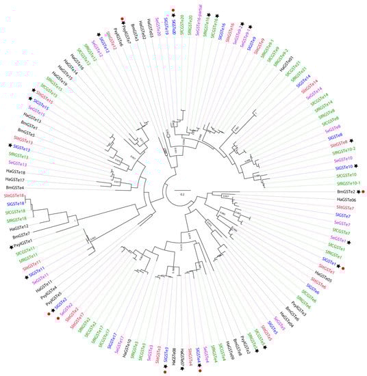 GST-mediated resistance could be triggered by different mechanisms, including gene amplification by multiple duplication events could lead to enhanced detoxification of insecticides underlying of the resistance process. Based on the recent availability of chromosome-level assembly genomes from spodopterans, we re-annotated GST epsilon class. For convenience, we reconciled the previous nomenclature with our new annotation to generate a unified dataset (see Supplementary Materials Table S2) [1,28]. Overall, GSTe accounts for nearly half of the total number of GSTs identified in the Spodopteran genomes (20 over 40 on average). Our phylogenetic analysis (Figure 6) revealed clear orthologous relationships among the four species studied with 1:1 orthologs in almost all cases, and with epsilon GSTs of H. armigera, suggesting that this great diversification is occurring in the Noctuoidea clade, and especially in highly polyphagous species.