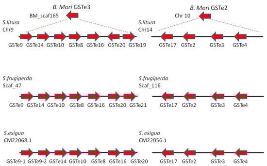 GSTe clusters derived from B. mori GSTe2 and GSTe3 identified in the genomes of S. litura, S. frugiperda corn and rice strains and S. exigua (adapted from [1]).