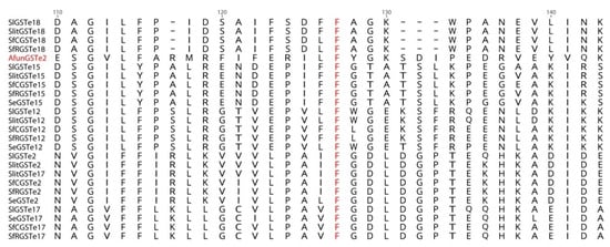 Alignment of a subset of GSTes from S. litura (Sl) S. frugiperda corn and rice strains (SfC and SfR), S. exigua (Se), S. littoralis (Slit) and AfunGSTe2 from Anopheles funestus (Afun, genbank accession number KC800363.1) harboring a L119F substitution. The L119F mutation (in red) is associated with DDT resistance in Anophelines [6].