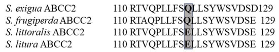 Alignment of a 20 amino acid sequence of ABCC2 from four Spodoptera species, presence of a glutamine or glutamic acid at position 119. Genbank accession number, S. exigua AIB06822, S. frugiperda AUO38740, S. littoralis, S. litura XM_022967434.
