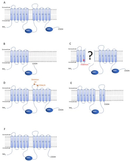 Protein structure of ABCC2 of Spodoptera spp from susceptible or resistant populations. (A) Protein structure of SfABCC2 and SeABCC2 wild-type. (B,C) Protein structures of SfABCC2 in resistant populations from Puerto Rico, * corresponds to an insertion of amino acids [114,115]. (D,E) Protein structure of SfABCC2 in resistant populations from Brazil [80,116]. (F) Protein structure of SeABCC2 from a laboratory selected strain [117].