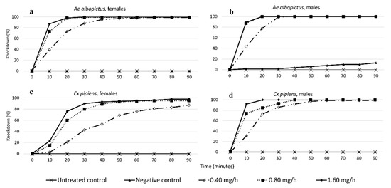 - Boubidi, S.C.; Rossignol, M.; Chandre, F.; Tounsi, R.; Lagneau, C.; Fontenille, D.; Reiter, P. Gender bias in insecticide susceptibility of Aedes albopictusis solely attributable to size. J. Am. Mosq. Control. Assoc. 2016, 32, 251–253. [Google Scholar] [CrossRef] [PubMed]