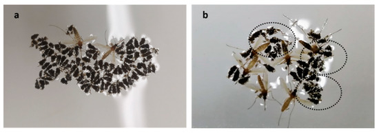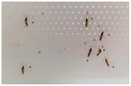 - Cx. pipiens females: Since they came from an autogenous strain, Cx. pipiens females did not need to consume blood to lay eggs. Forty-eight hours after the trial, they were given a tray containing water to allow egg laying. During this period, the number of females that drowned was noted for each treatment group.