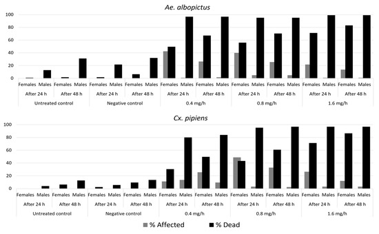 | Cx. pipiens | Females | Untreated vs. negative control | 3.15 | p = 0.07 |