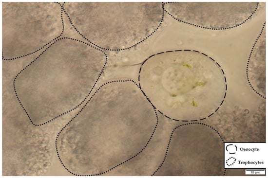 The fat body is made up of five main types of cells, which vary in composition, size, and function during the different stages of growth [,]. The morphology of the tissue is the same within a given species, but there may be some differences between species (e.g., different arrangement of cells) [,].