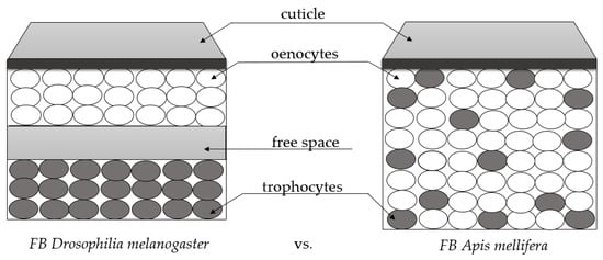 Fat body research presents scientists with many challenges because it is related to the differentiated structure of cells and tissues (structural and regional) depending on the type, species, stage of development, sex, caste, physiological state, environmental conditions, and even the location of the tissue in the insect organism. This creates many problems for the analysis of the same tissue, as the material must be collected from the right place under the right conditions for the results to be reliable []. In many species, we see the fat body as a tissue in which different types of cells are mixed together. However, new research shows that the fat body may be composed of several layers, with a given layer dedicated to only one type of cell (e.g., in Drosophila melanogaster). In flies, the subcuticular fat body is composed of several layers separated by free spaces. The layer contains only one type of trophocyte or oenocyte, which facilitates their preparation (Figure 2) []. In other insects (including the less primitive ones), such as the honey bee, the mixing of cells is observed at the level of one layer.