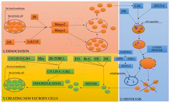 The process of metamorphosis of the fat body of insects. JH—juvenile hormone; 20E—20-hydroxyecdysone; EcR/USP—ecdysone receptor/ultraspiracle protein; Mmps 1–2—metallo-proteinases; CAC—caspase activity cascade; ATG5–6—autophagy-related proteins 5–6; AMPK—5′ adenosine monophosphate-activated protein kinase; TORC1—transducer of regulated CREB activity 1; ATG10–13—autophagy-related proteins 10–13; 93F—proper name of protein; Br-C—Broad-Complex gene; E93—ecdysone; IIS-TORC1—connection between IIS—Sensors insulin/IGF signaling and TORC1 signaling; Myc—proper name of gene regulator; Ckd2—cyclin-dependent kinase 2; Ckd4—cyclin-dependent kinase 4.