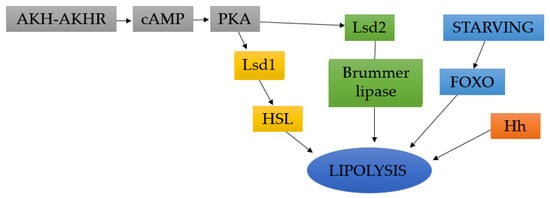 Lipolysis is conditioned primarily by the activity of Lsd1 and Brummer lipase, acid lipase, and hormone-sensitive lipase (HSL). The activation of Brummer lipase is influenced by Lsd2. The activity of Lsd2 and Brummer lipase is due to their phosphorylation by protein kinase A (PKA), which is activated by cyclic adenosine monophosphate (cAMP) production. This, in turn, is regulated by adipokinetic hormone (AKH) and adipokinetic hormone receptor (AKHR). HSL is induced by the activation of Lsd1, which is activated by AKH. In addition, LKB1–AMPK signaling is involved in activating lipolysis. The lipolysis process is inhibited by IIS, which stimulates lipid formation [,,,,,]. Lipolysis can be promoted by nutritional cues such as hunger. Hunger activates Forkhead box-containing transcription factors (FOXO), which inhibits IIS and transactivates Brummer lipase genes and acid lipase []. An additional mechanism that activates lipolysis is hedgehog signaling (Hh), which lowers the concentration of TGs and inhibits lipid formation (similar to FOXO) (Scheme 2) [].