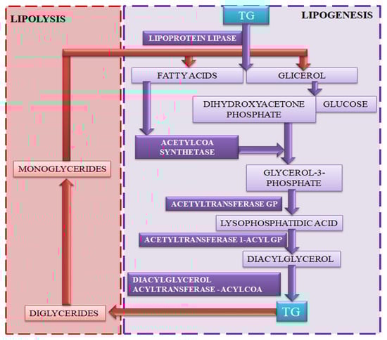 Starting with lipogenesis, the TGs are the most significant substrate and product of the pathway. The TG, most often found in the hemolymph, very low-density lipoprotein (VDVL), or chylomicrons, is derived from lipoproteins and hydrolyzed by the enzyme lipoprotein lipase. The process is stimulated by the presence of insulin and other VDVL compounds. The products of this hydrolysis are fatty acids and glycerol, components of TGs. The glycerol is then converted into glucose. On the cell surface, acetylCoA synthetase is formed from fatty acids and glycerol-3-phosphate (G3P) from dihydroxyacetone phosphate, which is derived from the transformation of glycerol to glucose with the help of acetylCoA synthetase. G3P can be formed through the following two processes: glycolysis, in which the substrate is glucose, or glycerogenesis from glycogenic substrates (i.e., pyruvate or lactate). Half of the glucose obtained from numerous changes is involved in the synthesis of fats and the stimulation of lipogenesis [,].