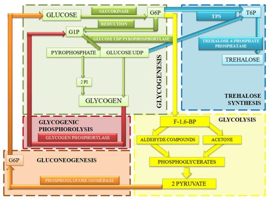 The conversion of glucose into its glycogen storage form follows the glycogenesis pathway and the insect organism can accumulate supplies for survival in the cells (e.g., diapause or high demand for energy such as during flights). Due to the enzyme glucokinase, the glucose molecule is converted to glucose-6-phosphate (G6P), which is then reduced to G1P. The acting glucose uridine diphosphate (UDP) pyrophosphorylase then converts G1P into UDP glucose and pyrophosphate. The pyrophosphate is converted to two Pi molecules in between (Scheme 4). Due to the resulting UDP glucose molecule, which is the donor of glucose residues, and due to glycogen synthesis, glycogen is maintained with the UDP molecule [,,].