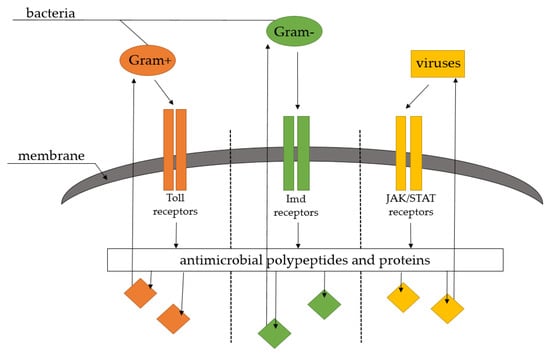- Lemaitre, B.; Hoffmann, J. The host defense of Drosophila melanogaster. Annu. Rev. Immunol. 2007, 25, 697. [Google Scholar] [CrossRef] [PubMed]