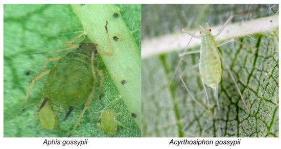 Aphids have a small body size and their development, survival, and reproduction are sensitive to changes in ambient temperature [11,14]. Aphis gossypii is a highly polyphagous pest infesting nearly 100 crop species throughout the world [15]. The crops damaged by Ap. gossypii include cotton, cucurbits, citrus, coffee, cocoa, aubergine, peppers, potato, and okra, as well as many ornamental plants. Acyrthosiphon gossypii (Mordviiko) has a narrower range of distribution in China compared with Ap. Gossypii, being found only in Xinjiang and Gansu provinces. Acyrthosiphon gossypii damages legumes and cotton [16]. In Xinjiang Province, both Ap. gossypii and Ac. gossypii co-occur as important pests of cotton [17]. However, Ap. gossypii may occur in the seedling, flowering, and boll stage of cotton growth, while Ac. gossippii generally occurs in the seedling stage [18].