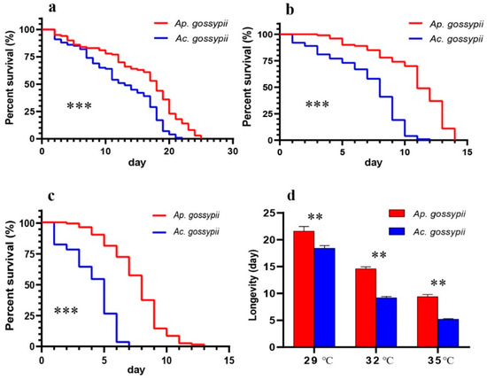 In general, the longevity of Ac. gossypii was reduced to a greater extent by high temperatures than the longevity of Ap. gossypii (Figure 2d). For example, an increase from 29 to 35 °C caused the longevity of Ac. gossypii to drop by 72%, while that of Ap. gossypii declined only 53%.
