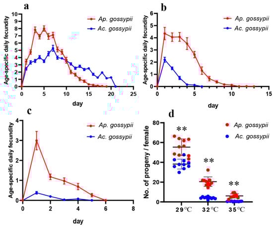 Age-stage-specific fecundity of adults of Aphis gossypii and Acyrthosiphon gossypii at different temperatures. (a) 29 °C; (b) 32 °C; (c) 35 °C; and (d) the scatter diagram of progeny per female. The results from two independent groups of fecundity were assessed using Student’s t-test. The error bars indicate standard error (SE). **, p < 0.01.
