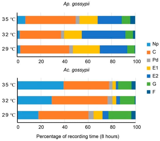 Data on the non-phloem phase variables of Ap. gossypii and Ac. gossypii at different temperatures (Table 1) show that the duration of non-probe (Np) events such as walking and resting for Ap. gossypii was significantly longer at 35 °C than at 29 °C (p < 0.001) and 32 °C (p < 0.001). However, the time spent in Np (non-probing/penetration) by Ac. gossypii was significantly higher than for Ap. gossypii at all temperatures (29 °C: p < 0.001; 32 °C: p < 0.001; 35 °C: p < 0.001; t-test); moreover, the time of the np phase of Ac. gossypii increased with rising temperatures. The percentage of non-probing behaviors of the total recording (8 h) was 2.71%, 2.28%, and 7.03% at 29 °C, 32 °C, and 35 °C for Ap. gossypii, respectively, which was lower than for Ac. gossypii (29 °C: 17.89%; 32 °C: 29.12%; 35 °C: 39.15%) (Figure 4). The intercellular stylet pathways (C) time was lower at 32 °C for Ap. gossypii compared with the other two temperatures. However, no significant differences were observed in the duration of the C waves (p = 0.096) and potential drops (Pd) (p = 0.055) of Ac. gossypii between the three temperatures. No significant differences were observed in the duration of short potential drops (Pd) (p = 0.109) or times spent feeding on xylem (G) (p = 0.942) for Ap. gossypii at all temperatures. However, the number of intercellular stylet pathways event (C) and potential drops (Pd) at 35 °C was significantly higher for Ap. gossypii than the other two temperatures. These results show that the number (p = 0.043) of potential drops (Pd) for Ac. gossypii at 35 °C was significantly lower than at 29 °C. The duration of xylem feeding events (G) for Ac. gossypii at 35 °C was significantly lower than at 29 °C (p = 0.039).