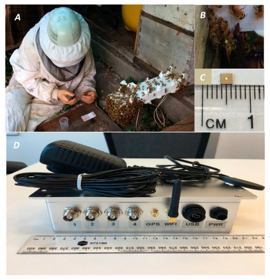 (A) Drones being tagged beside the hive. The white box at the entry is where the two pairs of patch-type RFID antennas are located. (B) Drone fitted with RFID microchip. (C) RFID microchip (Tag). (D) Reader unit with four connectors visible (one for each RFID antennas, Wi-Fi antenna, GPS connector and data and power connectors. A full description of this system is provided at [].