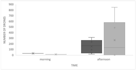 We found no significant differences between the observations made directly in the hive and those made by video recording (MWW, U = 15.5; p = 0.059). Similarly, we found no difference between drone activity in the morning and the afternoon, when comparing video recordings and direct observation (MWW, U = 23.0; p = 0.142; Figure 3). At the observed hives, drones tended to leave the hive at 11 a.m. during the mating seasons of 2015, 2016, and 2017. The highest activity in the morning corresponded to the arrival of drones to the hive. During these morning observations, we often recorded drones arriving but not entering the hive because the workers on duty did not let them in. When they arrived at the entrance, they either returned to flight immediately or took a short rest before flying again, or even stayed at the entrance for up to 30 min. Some drones that were leaving the hive, stayed at the entrance passing their front legs over their eyes and antennas, and then flew. All these behaviors occurred mostly in the mornings, when the flow of drones was small.