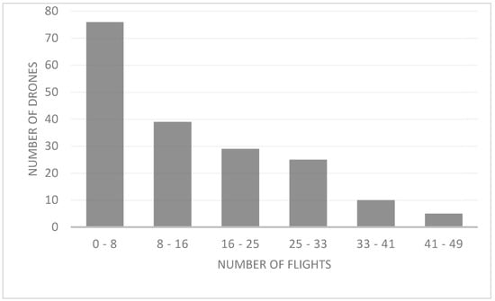 We found that drones exhibited 24-h activity (i.e., arrivals and departures). From the total of 200 drones tagged, 16 (8%) were not recorded during the experiment, possibly because the chip became unglued, or because drones left without entering the hive, were predated or mated and died. The scanner registered 20 (10%) drones with only one reading. This scanner reading may be because these drones went out looking for a DCA and were successful and died by mating or were unsuccessful and were lost or predated. The average total number of recorded flights per drone was 14.58 (min. = 1; max. = 49), with a maximum of 49 flights registered in three drones. We registered few drones with many flights and many drones with few flights (X2 = 346.471; df = 2; p < 0.000; Figure 4).