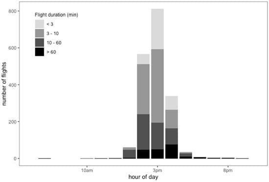 Number of flights according to flight duration in minutes of drones marked with RFID in different hour ranges during the mating season in NW Argentina.