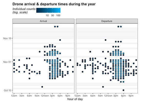 We were able to detect the activity of each drone that departed in the early morning and the late afternoon. We identified drones that departed and arrived up to four times in the early morning on separate days (such as Drone ID: 065 and 125 in Figure S1). One of them departed at dawn and other times of the morning and recorded more than five counts before midday (Drone ID: 065 in Figure S1, see violet points).