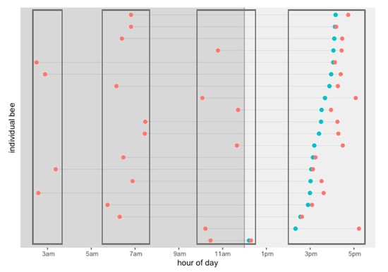 - Bloch, G.; Dan, P.T.; Robinson, G.E. Behavioral rhythmicity, age, division of labor and period expression in the honey bee brain. J. Biol. Rhythms 2001, 16, 444–456. [Google Scholar] [CrossRef] [PubMed]
