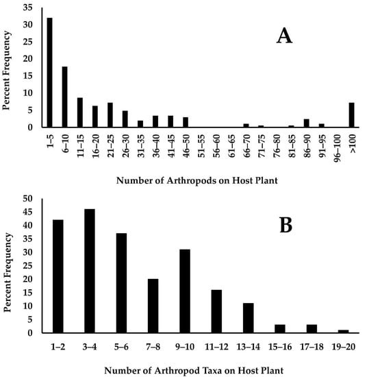 The number of arthropods and the number of arthropod taxa found on monarch host plants. (A) Total number of arthropods on monarch host plants grouped into intervals of five. (B) The number of taxa (taxon richness) found on monarch host plants grouped into intervals of two.