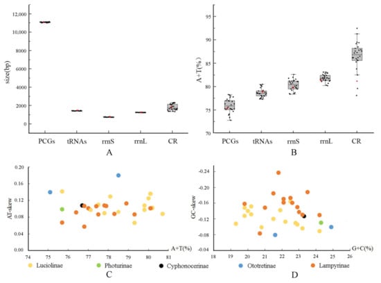 The size (A) and AT content (B) of PCGS, rrnL, rrnS, CR, and tRNA of 33 firefly species with the red dots representing C. sanguineus klapperichi (lower edge of the gray rectangle, 25 percentile; central black bar within the rectangle, median; upper edge of the rectangle, 75 percentile); Nucleotide composition of 33 complete firefly species, with the black dots representing the C. sanguineus klapperichi: (C) the A+T content and AT skew; (D) the G+C content and GC-skew.