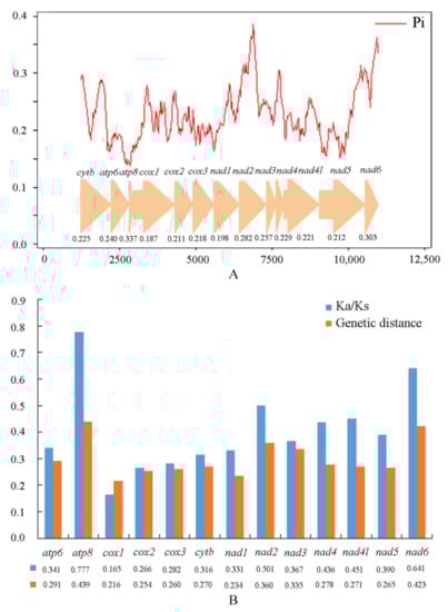 (A) The nucleotide diversity (Pi) of 13 protein-coding genes of mitogenome among 33 species of Lampyridae in a sliding window analysis (a sliding window of 200 bp with the step size of 20 bp); the Pi value of each gene is shown under the gene name. (B) Genetic distances and the ratio of non-synonymous (Ka) to synonymous (Ks) substitution rates of 13 protein-coding genes among 33 species of Lampyridae. The average value for each PCGs is shown under the gene name.
