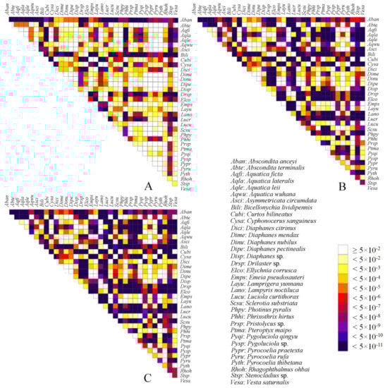 Heterogeneous sequence divergence of mitochondrial genomes of Lampyridae resulting from pairwise comparison of three aligned datasets: (A) PCG12rRNA; (B) PCGrRNA; (C) PCGRNA. The dark colors indicate the higher randomized accordance, while the lighter colors indicate the opposite. All taxa names (indicated by the abbreviations consist of the first two letters of the genera and species names, respectively) are listed on top and to the right of the heat map. While cells specify p-values > 0.05, indicating that corresponding pairs of nucleotide sequences do not violate the assumption of global stationary, reversibility, and homogeneity conditions.